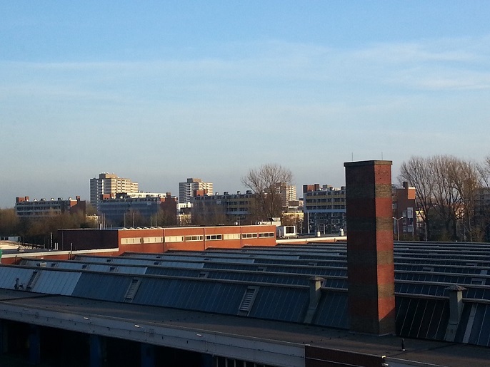 as for today, i am happy with the key to my new bike, a huge box of kitchen stuff (i see dishes and cutlery and a very red carving board!) and this sunset view from room 1330 at the student hotel in the nieuw-west area of the city: