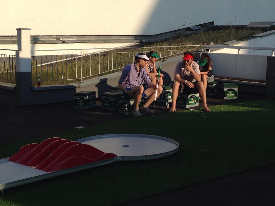 that’s why beer lifestylers beck’s, with some fake greens, cheap planks, and two brimming bars, turned the roof of a nasty parking garage in kreuzberg into a 12-hole parcours that’s just easy enough to be a good place to knock off work.