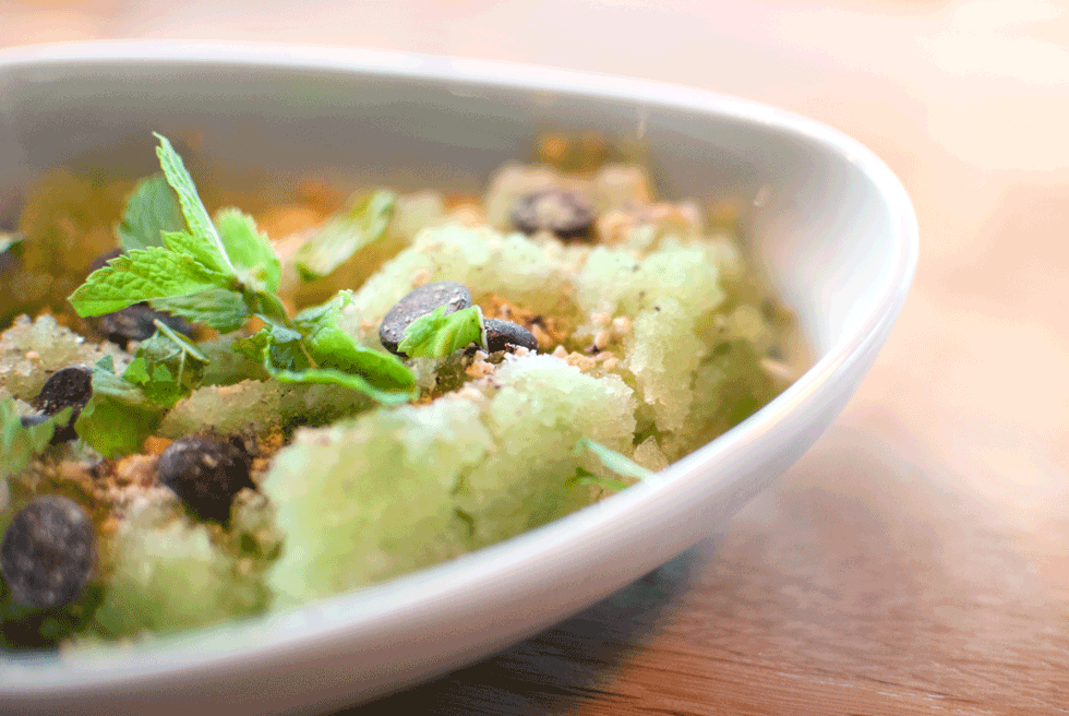 after all this, it seemed impossible for the dessert to go one better, yet the rightfully coined “happy ending” threw us for a loop: the heavenly granny smith apple granité (shahroudi has the pulp imported from france) on a bed of chocolate beans, peanuts, and mint, was delicious beyond words.