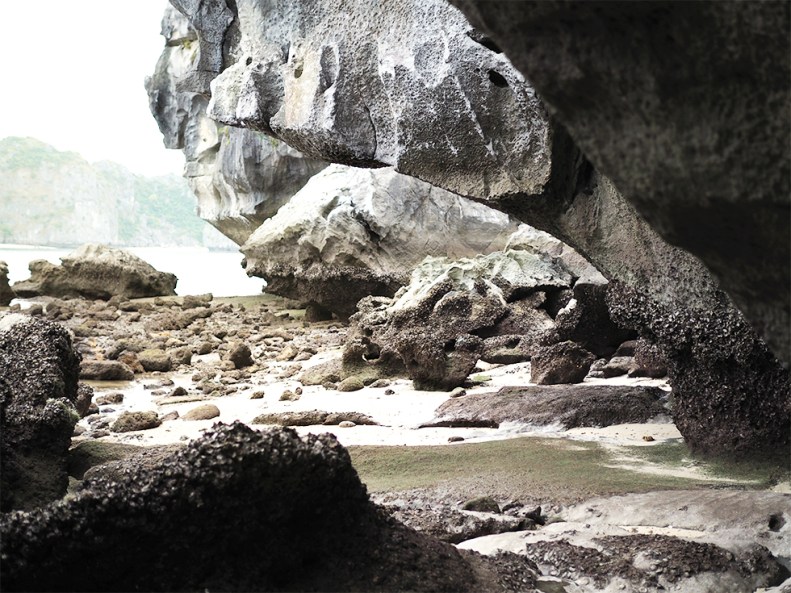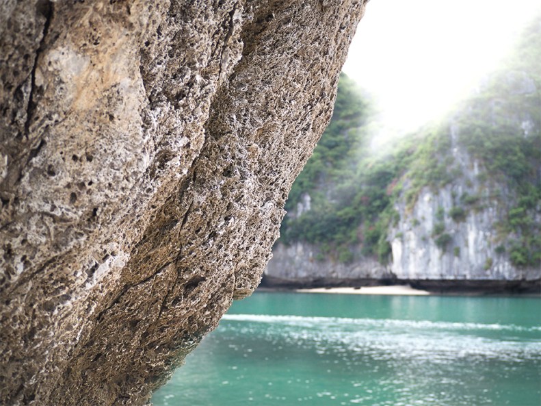 after having anchored, we enter a kayak to discover the bizarre landscape upclose, passing porous rocks, moving across black caves into blue lagoons, tiny colorful villages sticking to the massive walls of the karst. in the face of this unreal beauty, we feel incredibly small.