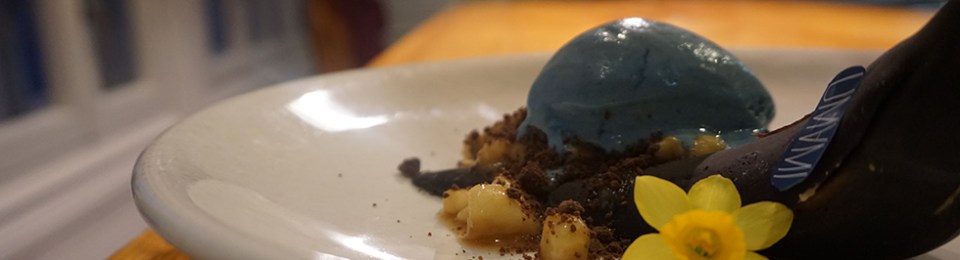following the roadtrip serving of a bunch of cute bao burgers (paneer from kalamatsi dairy) with umami french fries and a lighthearted celeriac-rucola salad with nuts, the dinner really kicked into gear when it turned to the poolparty dishes: avocado and crab, calamari salad, cauliflower risotto with cod cheeks (a true discovery!), bbq’ed octopus, oven-baked pumpkin with yoghurt and pesto, bell pepper letcho – the dishes just kept coming, finished off by the sweet space-inspired desert, warm banana with blue mint icecream…
