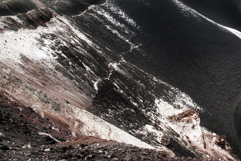 further up the cerro negro, a gust of wind arises, and the air turns cooler. still, the basalt under our feet is warm. however, its colors are changing, as iron, sulfur, and magnesium infuse its deep black with a smoldering palette of red, yellow, and white. all of a sudden, thick vapors are permeating the air. down in the maw, countless little volcanoes are seething and simmering.